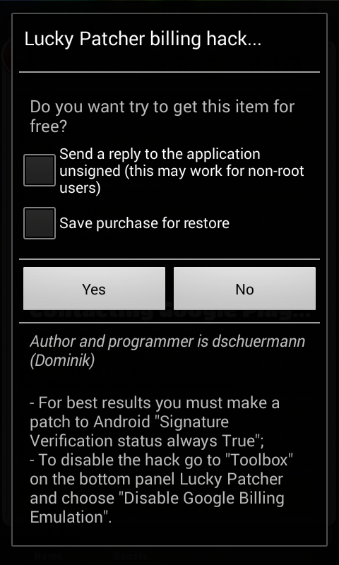 9. Now Lucky Patcher Billing Hack would ask to get that item for free. That's what we want. Click Yes. If it not works, turn on "Send a reply to the application unsigned" and try again.